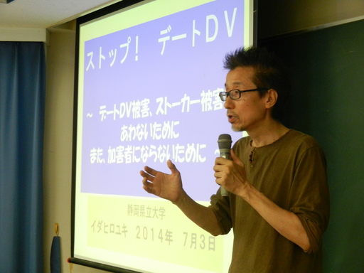 今回は、「性暴力とジェンダー」と題して、神戸大学・立命館大学・愛知淑徳大学の非常勤講師でデートDV防止ファシリテーターの伊田広行先生を大阪からお招きして講義をしていただきました。まず、最近の恋愛の実態としてのデートDVの定義や典型例の紹介などが行われ、ストーカーの増加などに触れられたた後、デートDVが力による支配であり、相手の安心、安全、自由、自己決定、成長を奪う行為であることが説明され、デートDVレベルや種類、また、なぜ相手と別れられないのかの根拠等が具体的に論じられました。