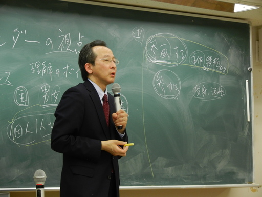 今回は前回に引き続き犬塚センター長が担当し、授業全体の概論部分の出発点として、男女共同参画社会という言葉の意味をどう理解するか、そのポイントを「男女」「参画」「共同」の3つの言葉の解釈を中心に詳しく論じました。特に「共同」という言葉の意味を的確に理解することを通じて、これまでの「性別役割分業」社会と「男女共同参画」社会の対比や、前者から後者への転換が現代社会で強く求められていることを理解することの重要性が強調されました。さらにこれまでの性別役割分業に代表されるジェンダーという言葉の基本的な意味、その問題点などについても、さまざまな分野の学問的成果を基に、具体的に解説が行われました。またとりわけ性別役割分業によって動いてきたこれまでの日本社会の問題点と限界が、グローバル化、経済・社会システムの転換、少子高齢・人口減少社会の進展という3点から詳しく論じられ、男女共同参画社会をめざした取組の重要性というメッセージが強調して語られました。