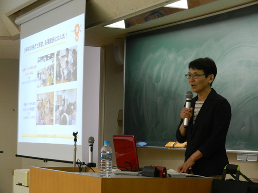 講義の後半では、現在実施されている支援事業や協働事業の例として、本学の学生も参加している「静岡学習支援ネットワーク」との連携事業、静岡県社会福祉協議会の助成事業として開講されている「ひとり親サポーター養成講座」、社会的事業・起業をテーマにした市民講座「地域デザインカレッジ」、「フードバンクしずおか」「外国助成DV被害者支援連絡会議」による生活困窮者の支援活動が紹介されました。また、静岡市女性会館の紹介ビデオが上映され、広く市民に開かれた活動の場でさまざまな事業や取り組みが行われていることが説明されました。講義の最後には、本学学生にも参加できる社会活動として、7月10日に行われる参議院議員選挙での投票の呼びかけがなされました。