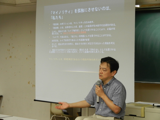 続いて、2015年末の日韓外相会談でこの問題の「最終的かつ不可逆的解決」をめざした合意がなされた出来事が取り上げられ、これに対して被害者(サヴァイバー)・支援団体からは強い不満の声が上がったこと、そこには、当事者の声を無視して国家間で政治的解決が図られたことの問題性、そして、彼女たちの求める「歴史的な名誉の回復」の意義をどうとらえるべきか、という問題提起がなされました。そこであらためて「慰安婦」という言葉が作り出すイメージが、結局自分の意思による商行為者としての「売春婦」というイメージにつながるものであることが論じられ、国連での報告で用いられている「レイプ・センター」における「性奴隷」といった表現がついに日本社会に浸透してこなかった背景に存在している「加害者側」の視点こそが問題であることが厳しく指摘されました。そして日本における「慰安婦」問題がこのように「売春婦」言説に陥ることで、彼女たちが国家による組織的なレイプ被害者としての地位を確保することが著しく困難になり、結果として「マイノリティ」としてのポジションに本質的に置かれてしまう「記憶の暴力」のメカニズムが明確に解明されました。その上で私たちに課された課題として、彼女たちの「私たちは「慰安婦」ではない」という声を真摯に受け止め、彼女たちを「レイプ被害者」として位置づけることで、この問題を現代の私たち自身の問題とすることができること、さらに「加害者」の存在も確定させ、彼女たちの歴史的な「名誉の回復」という正義を実現する可能性が開かれることの意義が示されました。そして最後に、彼女たちが「汚れている」のではなく、彼女たちを「汚れた女」として位置づける社会構造(ミソジニー)にこそ問題の根源があることがあらためて強調されました。