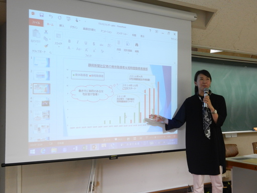 続いて石井先生からは、これまでの記者としての職業キャリアについての自己紹介を通して、特に出産を契機にそれまでさほど感じなかった女性がメディアで働く上での大きな男性との格差に気づきながらも結局マミートラックを歩まざるを得なくなる経緯や、石井先生が現在担当されている静岡新聞金曜夕刊の新プロジェクト「こち女(こちら女性編集室)」の担当と取材活動を通して知った静岡県での女性労働の実情、特に多くの県内企業における女性活躍のための取組のさまざまな実例の紹介とダイバーシティの実現に向けた課題が語られました。