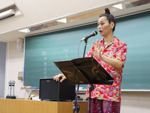 犬塚センター長の紹介の後、特別講義として、一五一会の演奏と自作の歌を織り交ぜながら、会津さんによるトランスジェンダー(MtF)としての自分の人生のさまざまな体験と思いとが語られました。